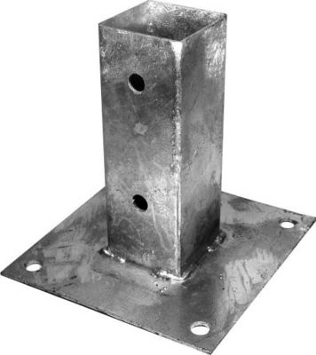 Een middenvast staafbeugel met een blad om op beton te bouten en te plaatsen.een slot wordt gesneden in de basis van de houten post te passen over de post ondersteuning geven van een nette afwerking met alleen de bouten te laten zien.